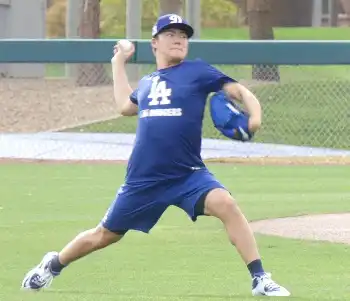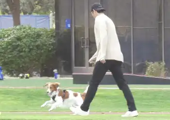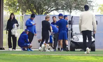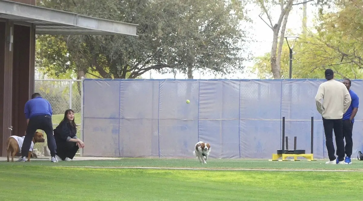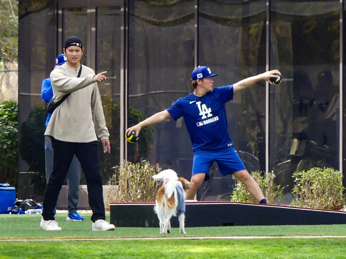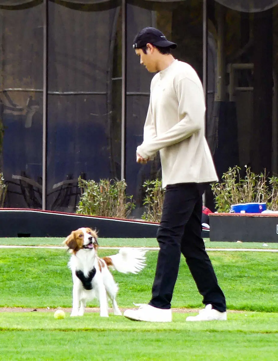 <大谷自主トレ>デコピンと遊ぶ大谷に真美子夫人、山本も笑顔(撮影・柳原 直之)