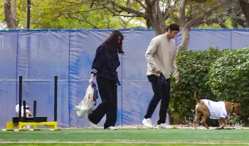 <大谷自主トレ>真美子夫人(中央)、デコピン(左)と引き揚げる大谷(撮影・柳原 直之)