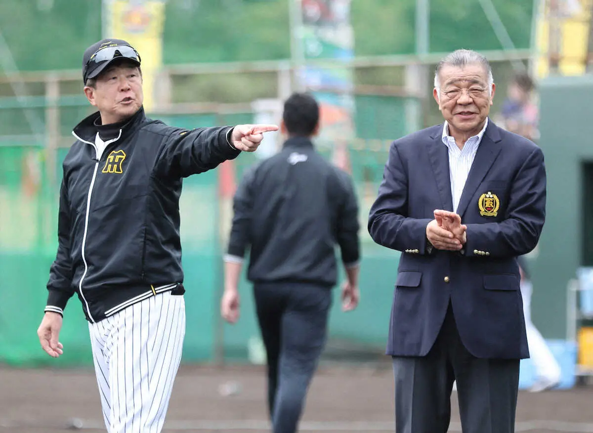 <阪神2軍キャンプ>掛布顧問(右)と話す平田ヘッドコーチ (撮影・奥 調)