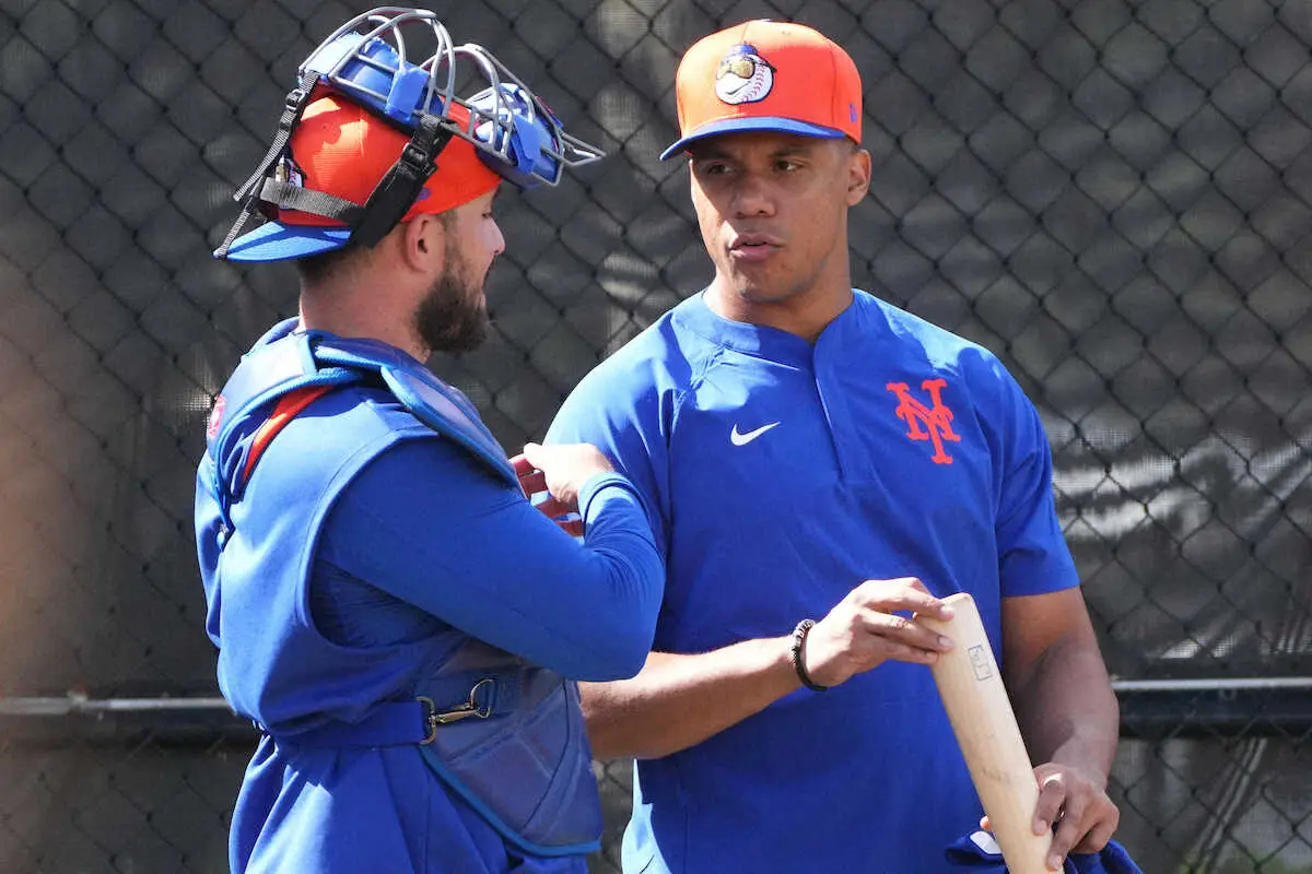 メッツのキャンプに合流したソト(右)は捕手のトーレンスと話す(ロイター)
