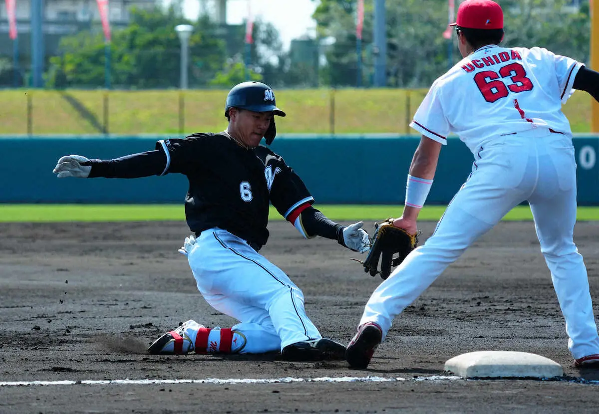 ロッテの新背番号「6」が躍動した。ドラフト1位・西川(青学大)が実戦4戦目となった広島との練習試合で3打数3安打1打点。青学大の先輩で、先代「背番号6」の前監督・井口資仁氏もネット裏で観戦した試合で初の猛打賞を記録し、開幕スタメンへ猛アピールに成功した。