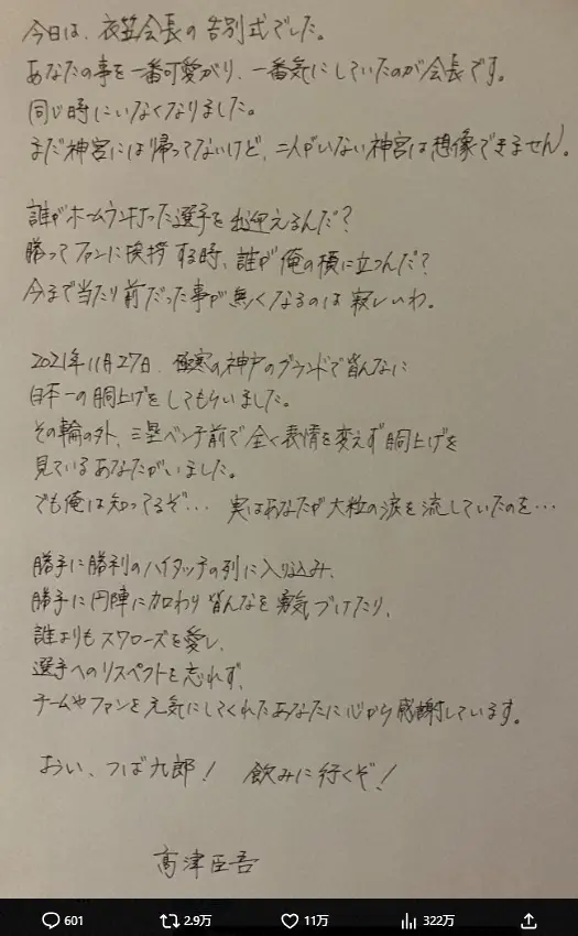 記者の質問に答える高津監督(撮影・尾崎 有希) Photo by スポニチ ヤクルト・高津監督 つば九郎担当者へ追悼の直筆手紙「寂しい」 愛情こ… ギャラリーで見る この記事のフォト 2025年02月21日の画像一覧 もっと見る 2025年02月21日の画像をもっと見る