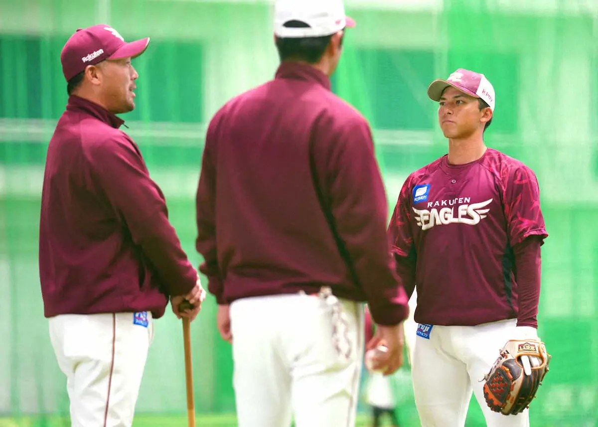 楽天・ドラフト1位の宗山(明大)が、沖縄・金武キャンプで三木監督から直接指導を受けた。全体練習後、室内練習場の特守で併殺時の二塁送球を繰り返した。