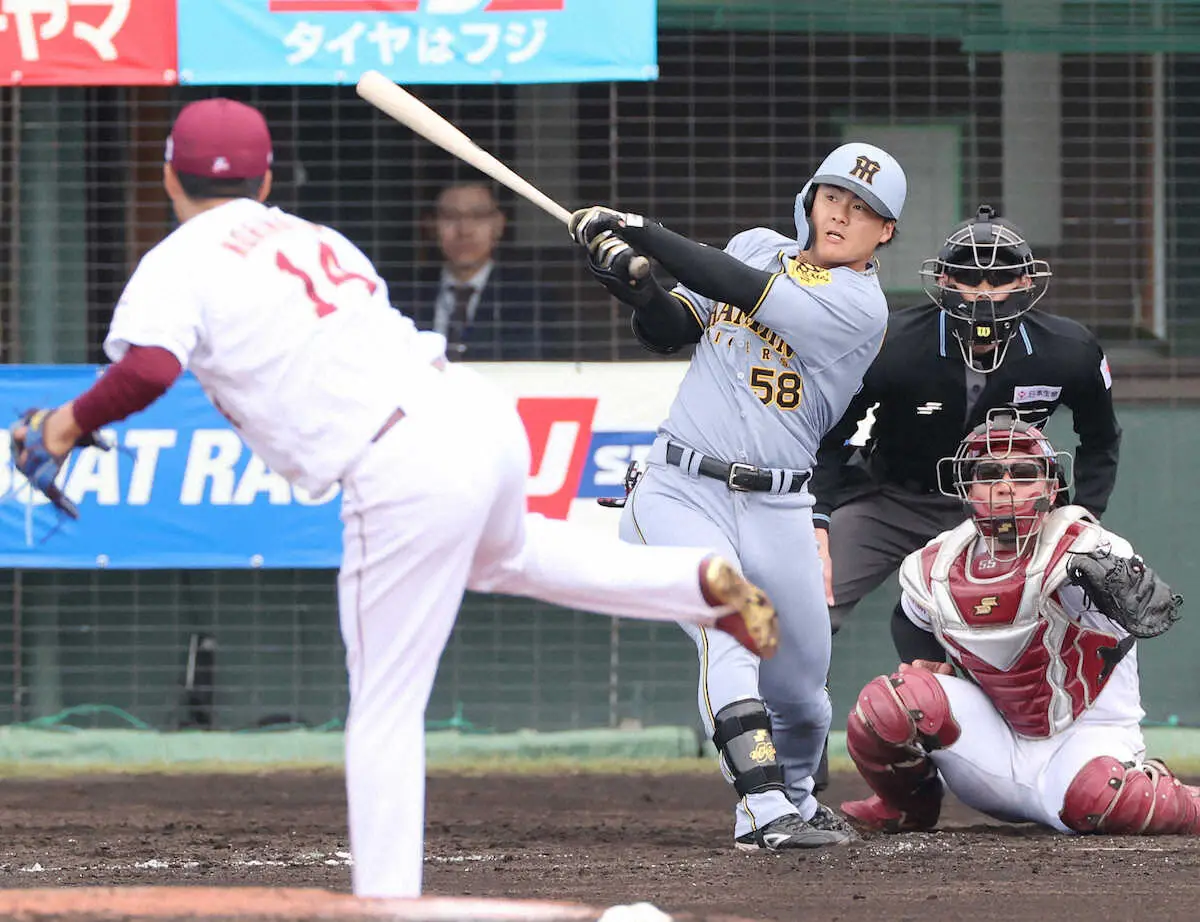 プロ野球のオープン戦が22日に沖縄、宮崎両県内で開幕した。藤川球児監督(44)率いる阪神は楽天戦(金武)に臨み、7―7で引き分けた。新監督の初星はお預けも、前川右京外野手(21)は1点優勢の3回2死一、二塁でチーム1号の特大3ラン。昨季のパ・リーグセーブ王・則本の内角高め直球を砕き、高卒4年目でオープン戦初アーチを放った。左翼の定位置奪取へ燃える若虎が、飛躍の25年シーズンへ最高のスタートを切った。