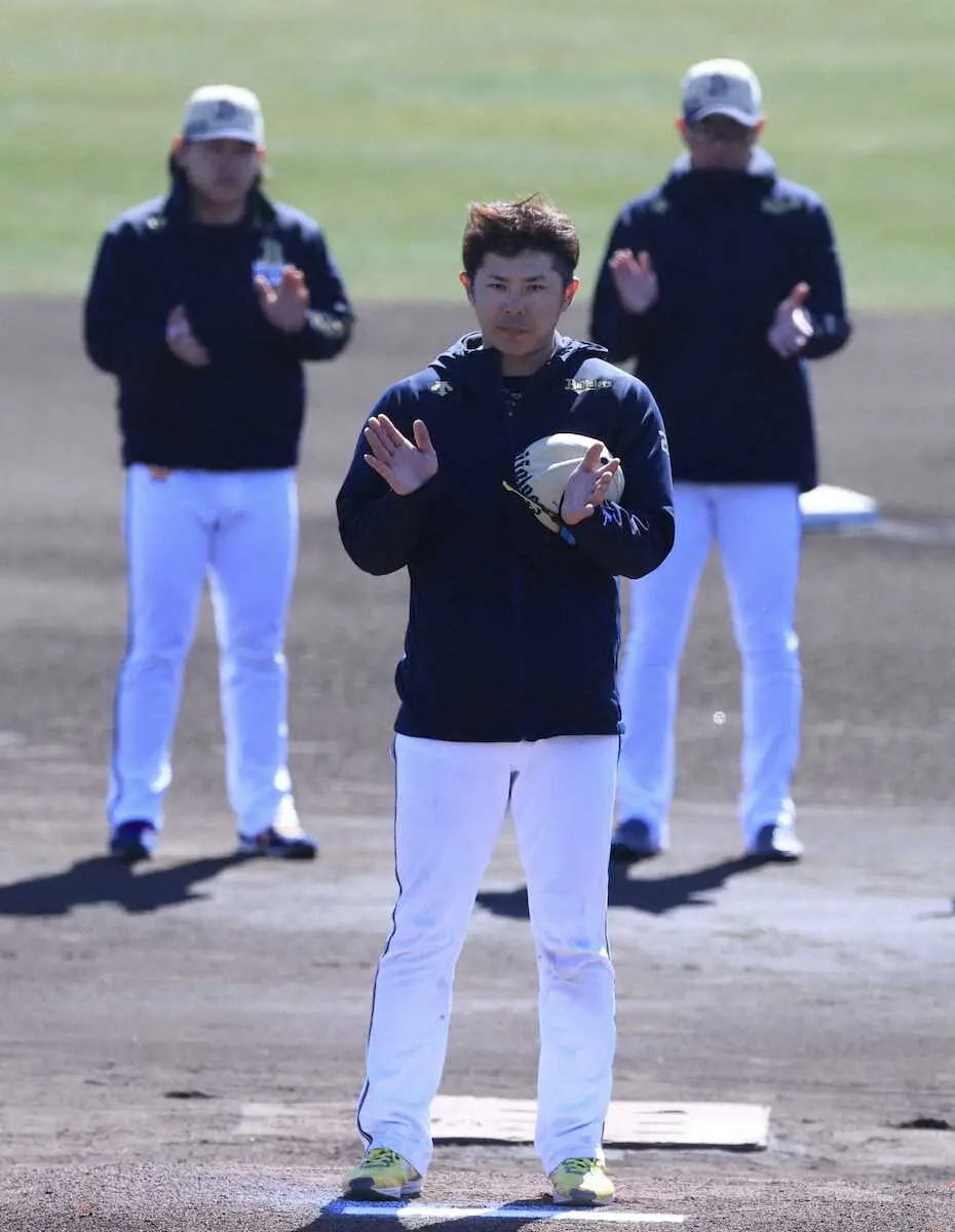 B組がSOKKENスタジアムで熊本ゴールデンラークスと練習試合を行っている中、試合に出場しない選手や岸田監督ら首脳陣は午後1時から隣接する清武第二球場に集合し、手締めが行われた。