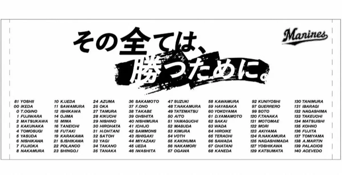 チームスローガン&オールメンバーグッズはフェイスタオルやTシャツ、トートバッグなど計7商品で展開され、今年のチームスローガン「その全ては、勝つために。」をメーンに吉井理人監督をはじめ、3月1日時点の支配下登録選手と育成選手計88人の背番号とネームが入ったデザインとなっている。