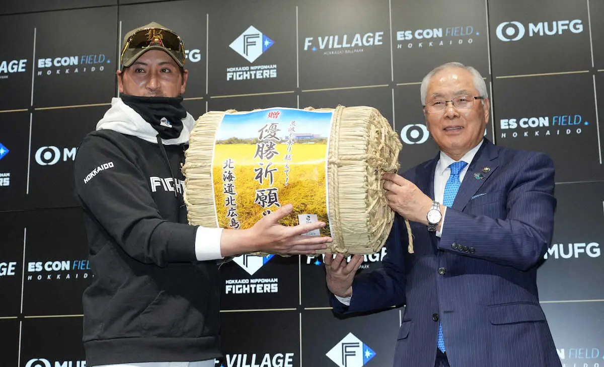 同市の上野正三市長から優勝祈願米とした道産米のゆめぴりか60キロが贈られ、新庄監督は「僕はゆめぴりかの大ファンなので、毎日食べてます」と大喜び。