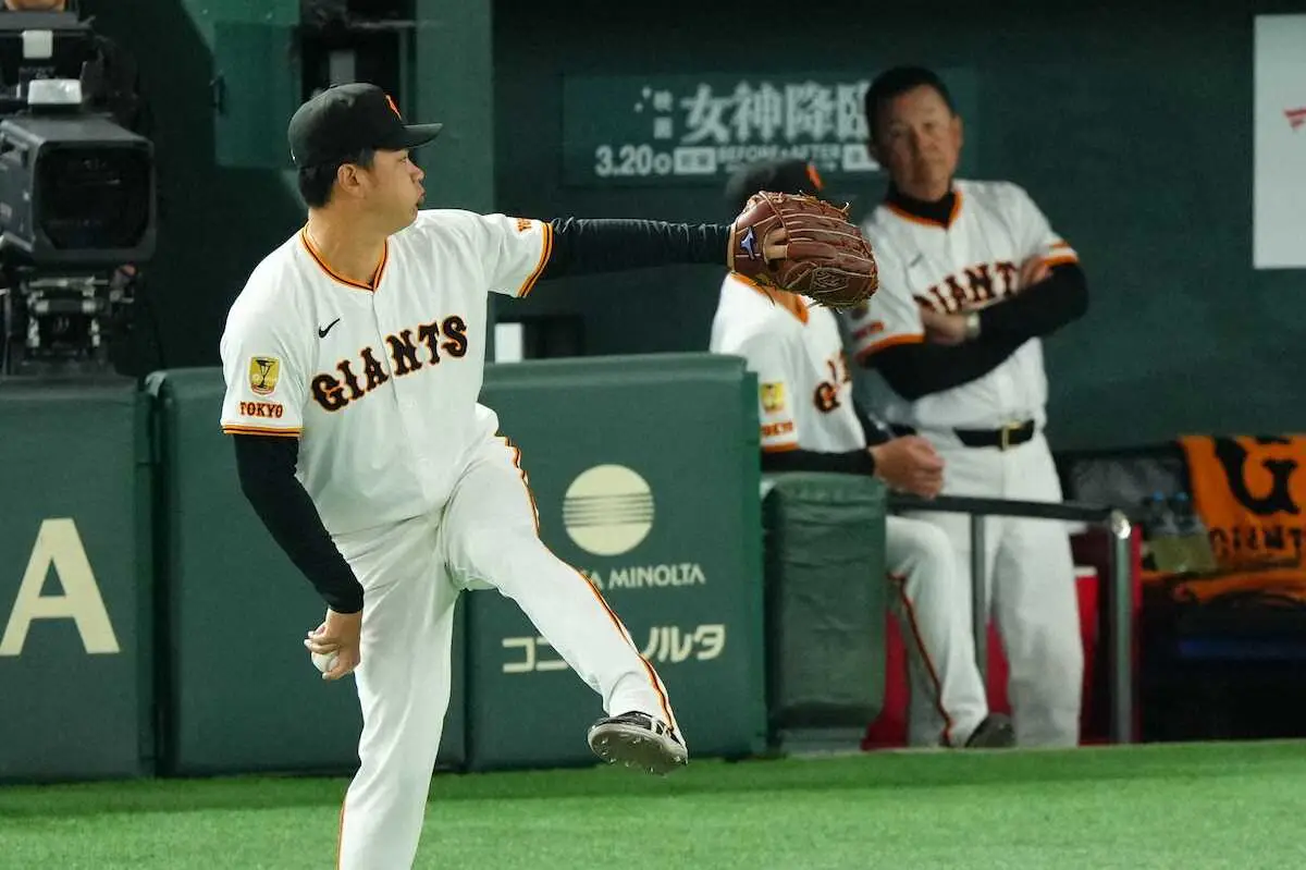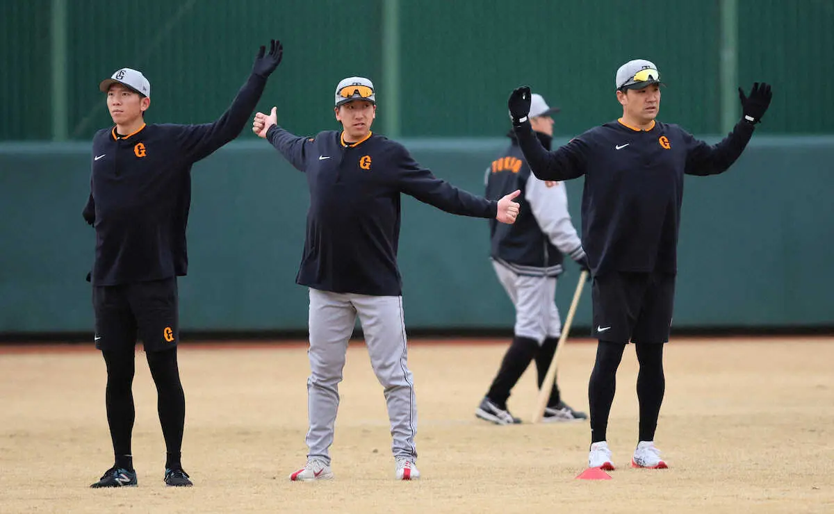 <巨人練習>ウオーミングアップする(左から)戸郷、大勢、田中将(撮影・尾崎 有希)