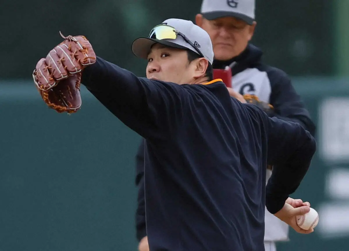 <オープン戦 巨・ヤ>久保巡回投手コーチが見つめるなかキャッチボールをする田中将(撮影・西尾 大助)