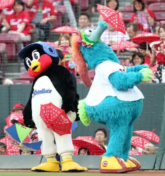 つば九郎は1994年4月にデビューし、1995年7月デビューのスラィリーは1年後輩。これまで何度もお互いのホームで試合前イベントに登場して共演し、つば九郎がスラィリーの持っていたバズーカを受け取ってスラィリーのおなかに発射したり、つば九郎がタックルしてスラィリーを倒したり、一緒に「空中くるりんぱ」をしたりして両チームのファンを楽しませてきた。