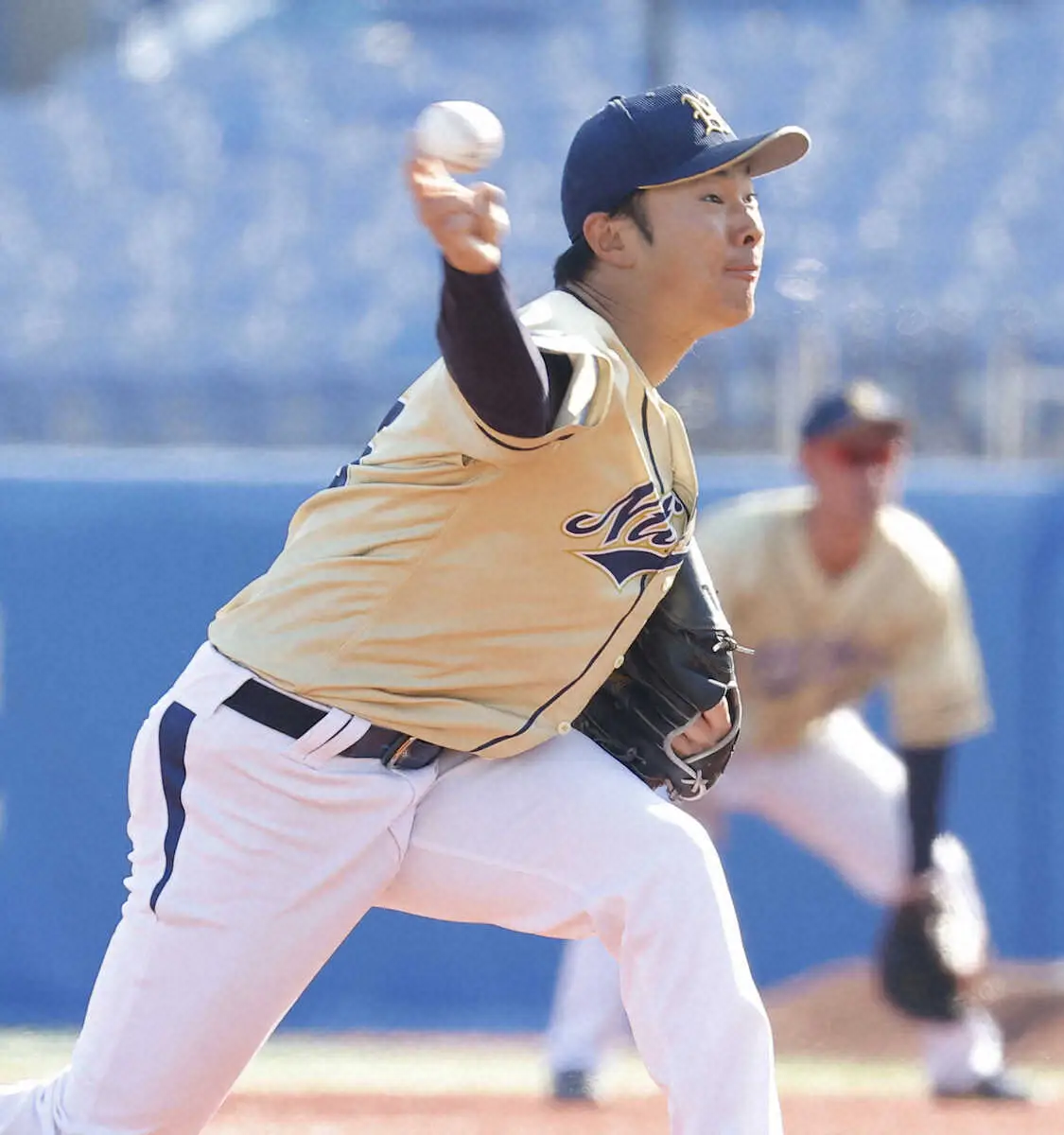 東大出身右腕・井沢は6回から登板し、4イニングを無安打無失点、5奪三振の力投。「テンポ良く投げて相手に隙を見せない投球をしようと思った」と笑顔だった。