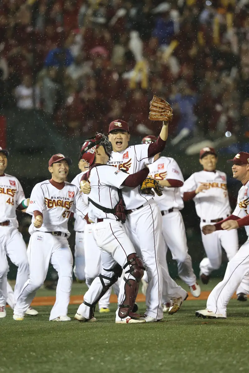 13年、日本一を喜ぶ田中将(中央)ら楽天ナイン