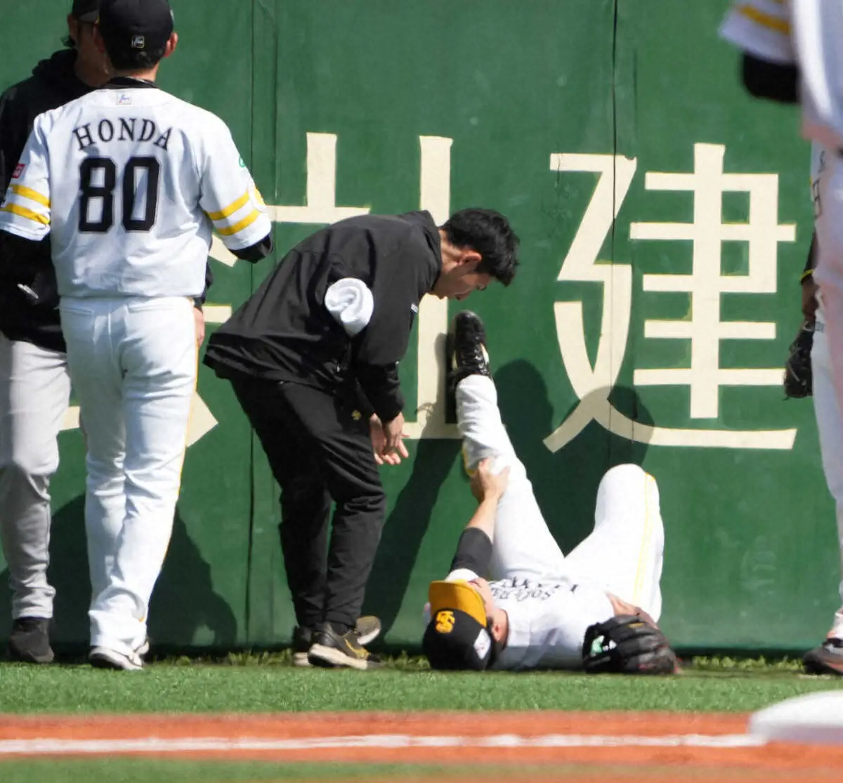 ソフトバンク栗原に痛すぎるアクシデント 三塁フェンスに激突し左膝強打 担架で運ばれ交代