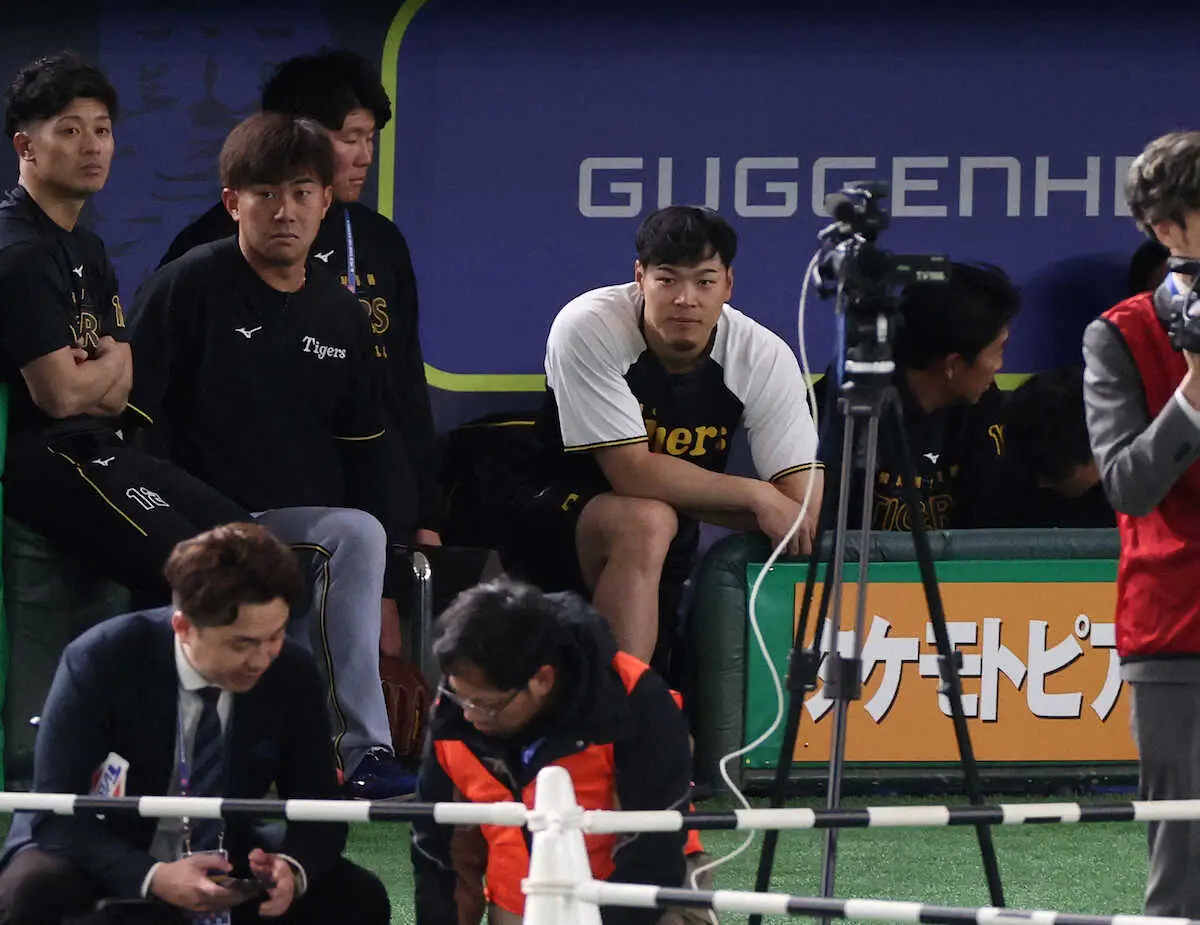 阪神の佐藤輝、大山、中野、糸原、坂本、桐敷が、カブスの試合前練習に合わせてロッカールームを出てダッグアウトに姿を見せた。将来的な米大リーグ挑戦の夢を持つ佐藤輝は、前屈みになってノックをじっと見つめた。