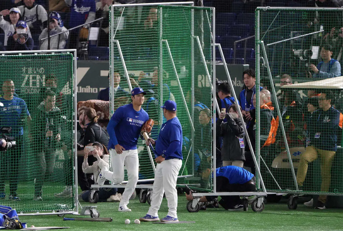 巨人は15日、ドジャースとのプレシーズンゲーム(東京D)に臨む。試合前にドジャースが練習を行い、巨人の若手選手たちが熱視線を送った。