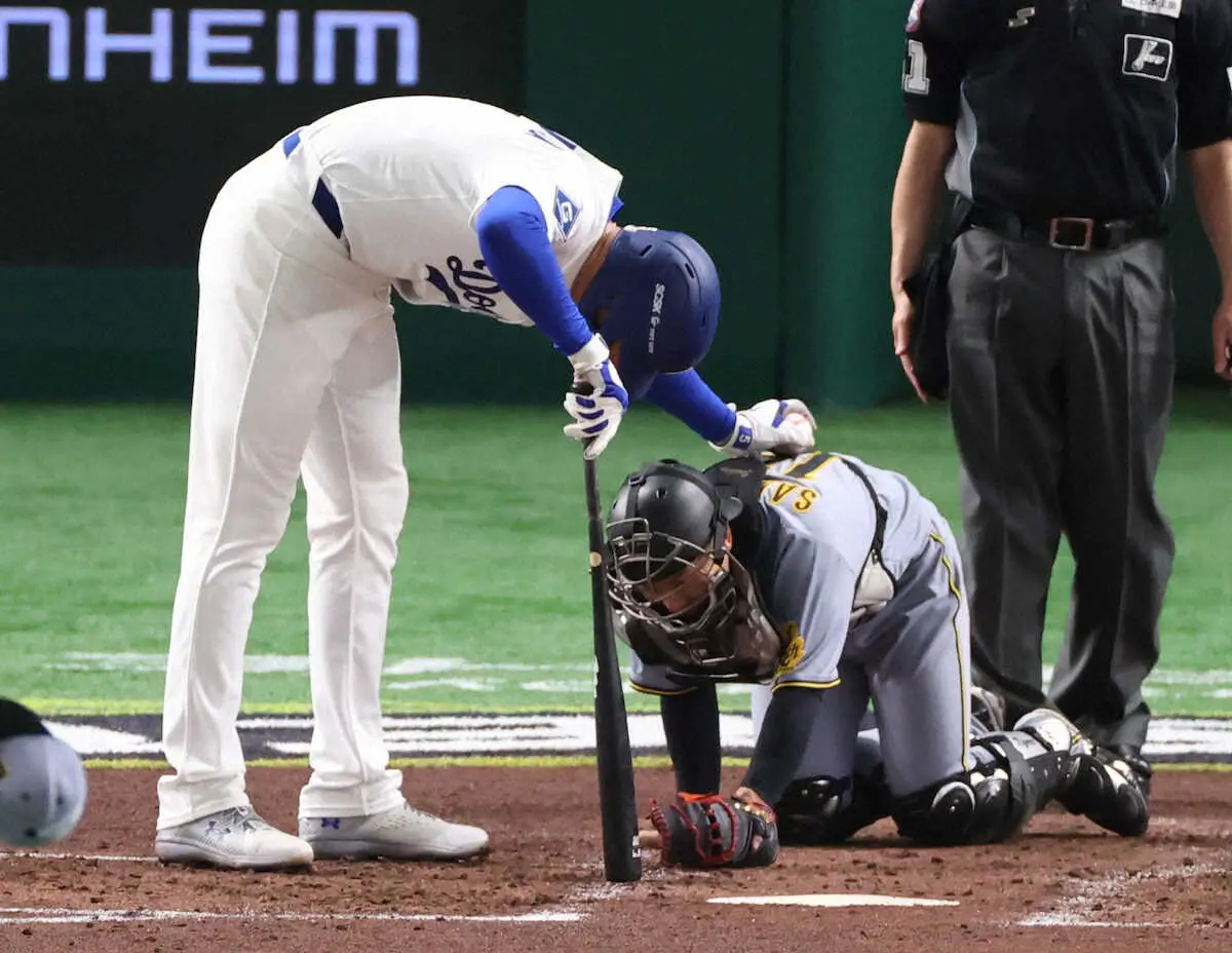 4回1死、フリーマンは第2打席で3球目、才木のフォークに反応もファウルとなった。そのボールが阪神捕手・坂本の下腹部付近を直撃。うずくまって痛がるのを見たフリーマンは背中に手を添えて「大丈夫?」と言わんばかりに心配した。