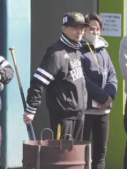 春季キャンプの練習を見守る王会長(撮影・岡田 丈靖)