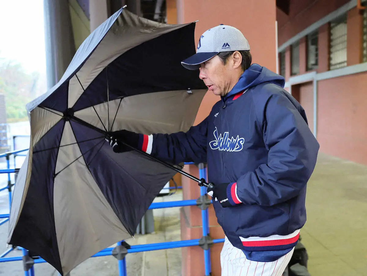 オープン戦<ヤ・オ 雨天中止>室内練習場に向かう高津監督(撮影・尾崎 有希)