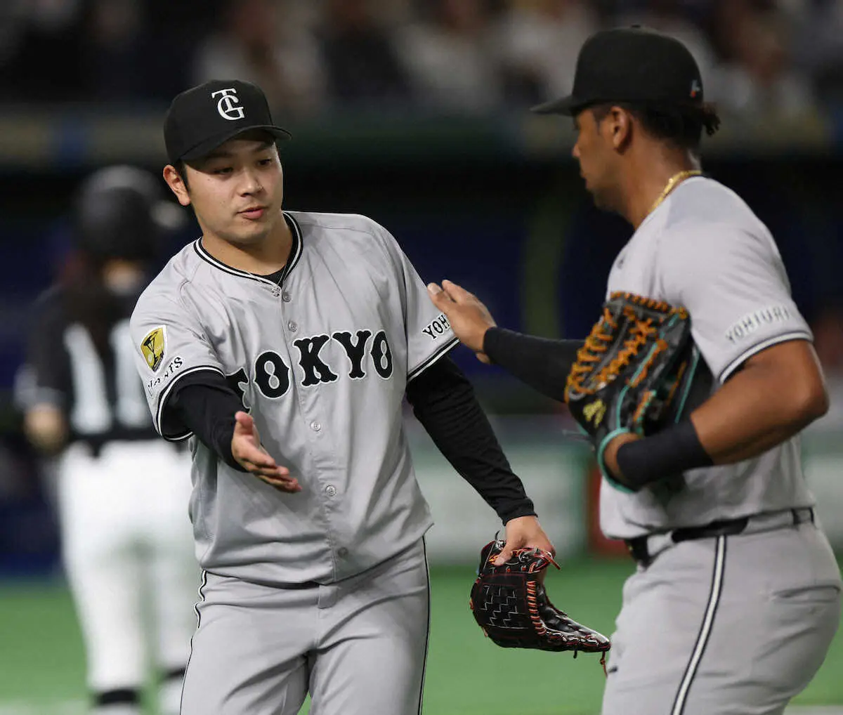 <巨人・カブス>3イニングを無失点に抑えオコエを迎える石川達(撮影・篠原岳夫)