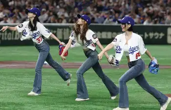 「MISAMO」3人 阪神―ドジャース戦で始球式「楽しく投げられた」 練習中にはロハスから指導