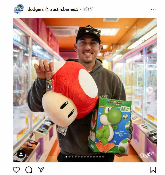 ドジャースの球団公式インスタグラムが17日に更新され、オースティン・バーンズ捕手(35)が日本のゲームセンターを楽しむ様子が公開された。