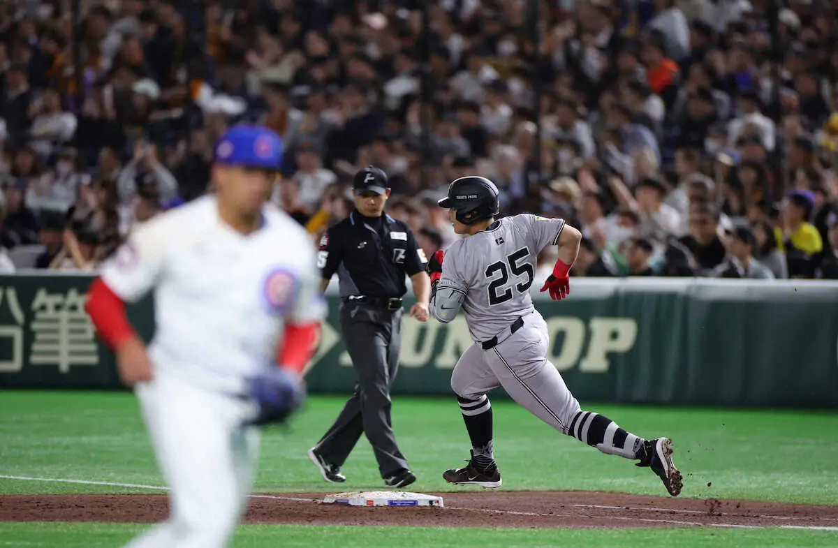 4万人超の観衆を最も盛り上げたのは巨人の4番・岡本だ。5回2死一、二塁でカブス2番手の右腕パレンシアの97.7マイル(約157キロ)の直球を捉えて左中間を破る2点二塁打。阪神―ドジャース戦を含む2試合で最速の打球速度112.6マイル(約181.2キロ)に「オープン戦を通して、ああいう当たりは出ていなかったので良かった」と胸を張った。