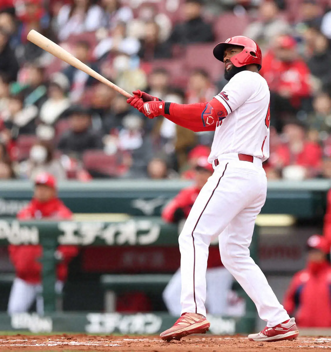 オープン戦11試合31打席目に飛び出した待望の来日1号は、チームの勝利に結び付く先制2ラン。変化球を多投する日本流への順応に手間取り、打率1割台の低空飛行が続く新助っ人は破顔一笑だった。赤いファンからも大歓声が上がった。