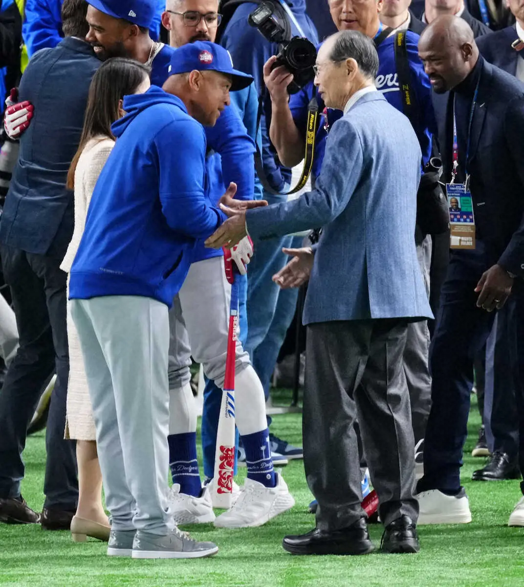 開幕戦の試合前にグラウンドで記念撮影をする(右から)ドジャースのロバーツ監督、王さん、ドジャースのアナウンサー、ハロルド・レイノルズ氏 Photo by スポニチ ドジャース・ロバーツ監督 開幕戦前に“世界の王”と記念撮影 感激の表情… ギャラリーで見る この記事のフォト 2025年03月18日の画像一覧 もっと見る 2025年03月18日の画像をもっと見る
