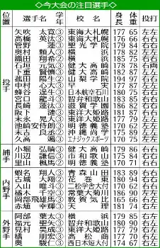 遊撃手にも好素材がそろう。天理の赤埴(あかはに)は勝負強い打撃が持ち味で、昨秋の公式戦で三振0。昨夏甲子園を経験している花巻東・森下、小柄ながらセンスの良さが光る敦賀気比・岡部、二松学舎大付・入山も攻守の要だ。