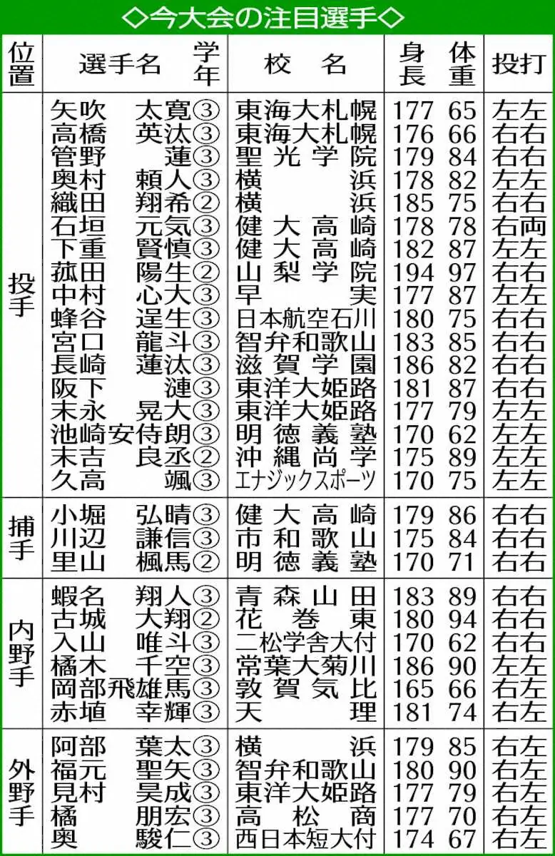 大会連覇を狙う健大高崎のエース右腕・石垣は、150キロを超える直球が武器の本格派。大会前に痛めた左脇腹に不安はあるが、安定感の光る左腕・下重も控える。東洋大姫路の阪下も球威で押すタイプの右腕。横浜は左腕・奥村頼、右腕・織田の二枚看板と、前チームから主将の中堅手・阿部葉にも注目だ。