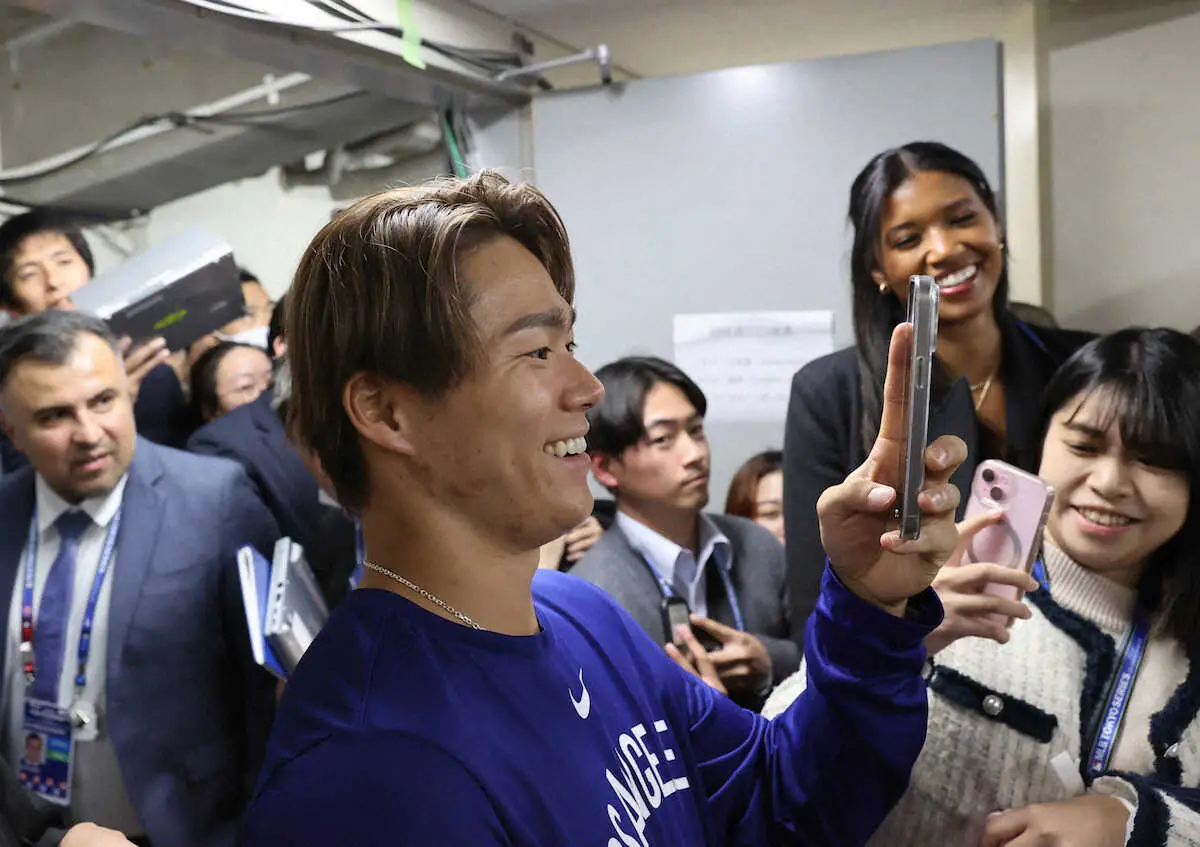 試合後、会見に臨む大谷をスマートフォンで撮影するドジャースの山本