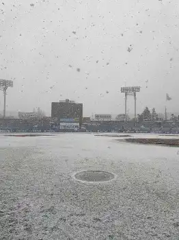 グラウンドは土部分にシートが敷かれているものの、芝部分は一面、白く彩られた。今後のグラウンド状況が懸念されたが、午前10時10分に天候不良のため、中止が発表された。
