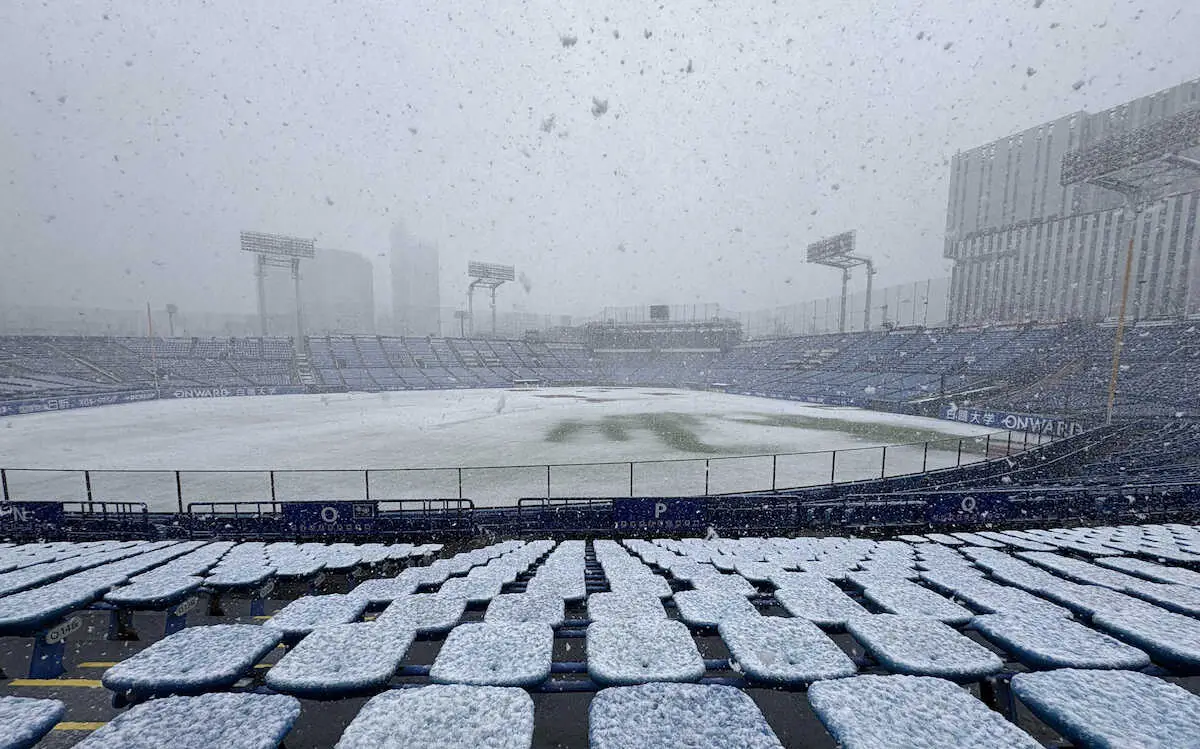 <ヤ・神 雨天中止> 雪の舞う神宮球場(撮影・大森 寛明)