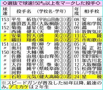 ≪同校甲子園最速≫横浜の織田が最速152キロを記録。選抜では平生拓也(08年宇治山田商)、藤浪晋太郎(12年大阪桐蔭)の153キロに次ぎ、菊池雄星(09年花巻東)、西浦健太(10年天理)、安楽智大(13年済美)に並ぶ3位タイで2年生では前記安楽に並ぶ最速タイ。横浜では98年夏に松坂大輔が記録した151キロを上回り同校甲子園最速だ。なお高校生最速は佐々木朗希(大船渡)が19年の日本代表候補合宿の紅白戦で記録した163キロ、甲子園では01年夏の寺原隼人(日南学園)の158キロ。