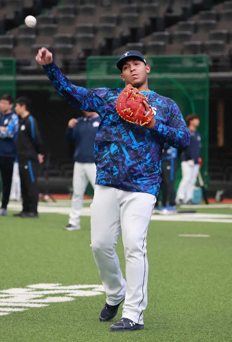<西・D>試合前練習に参加、キャッチボールをするセデーニョ(撮影・篠原岳夫)