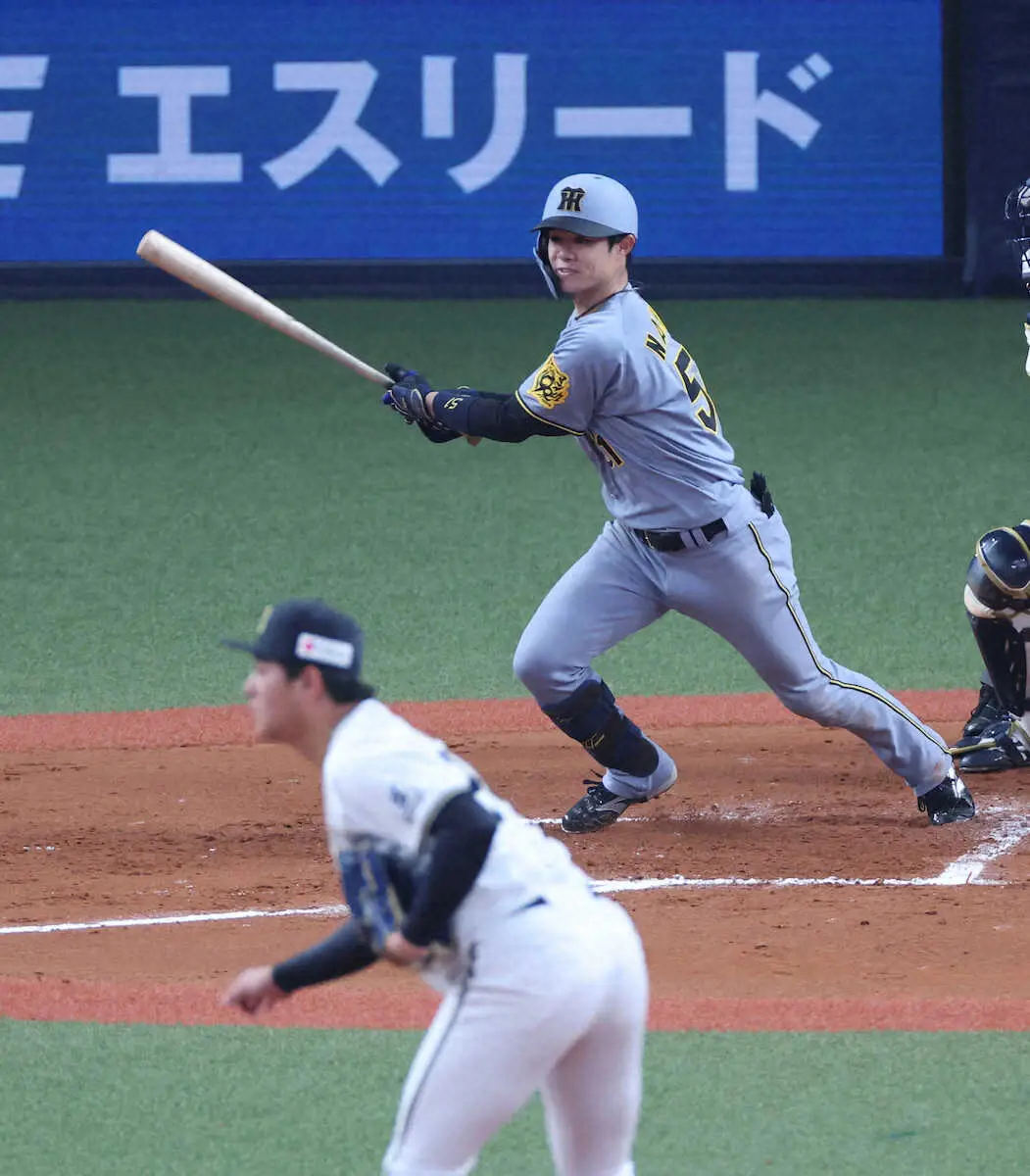 自賛の猛打賞だ。まずは3回1死から一塁左へ転がし、ベースカバーに入った宮城との競走に勝って内野安打。5回2死一塁では本田圭の高めスライダーに対して巧みにバットをかぶせ、右前へ運んだ。極め付きは7回1死一、三塁の第4打席だ。1番・近本が放った中前打の流れに乗り、川瀬の内寄り直球を鋭く叩いて再び右前へ。同点適時打とし、オープン戦初打点を刻んだ。