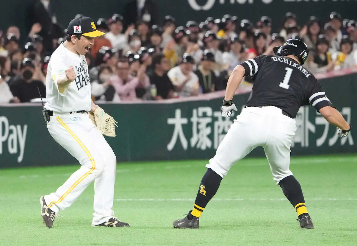 ホークスOB戦<黒鷹軍・白鷹軍>3回、3ランを放った内川氏は三塁手・松田氏(左)と“熱男”共演(撮影・岡田 丈靖)