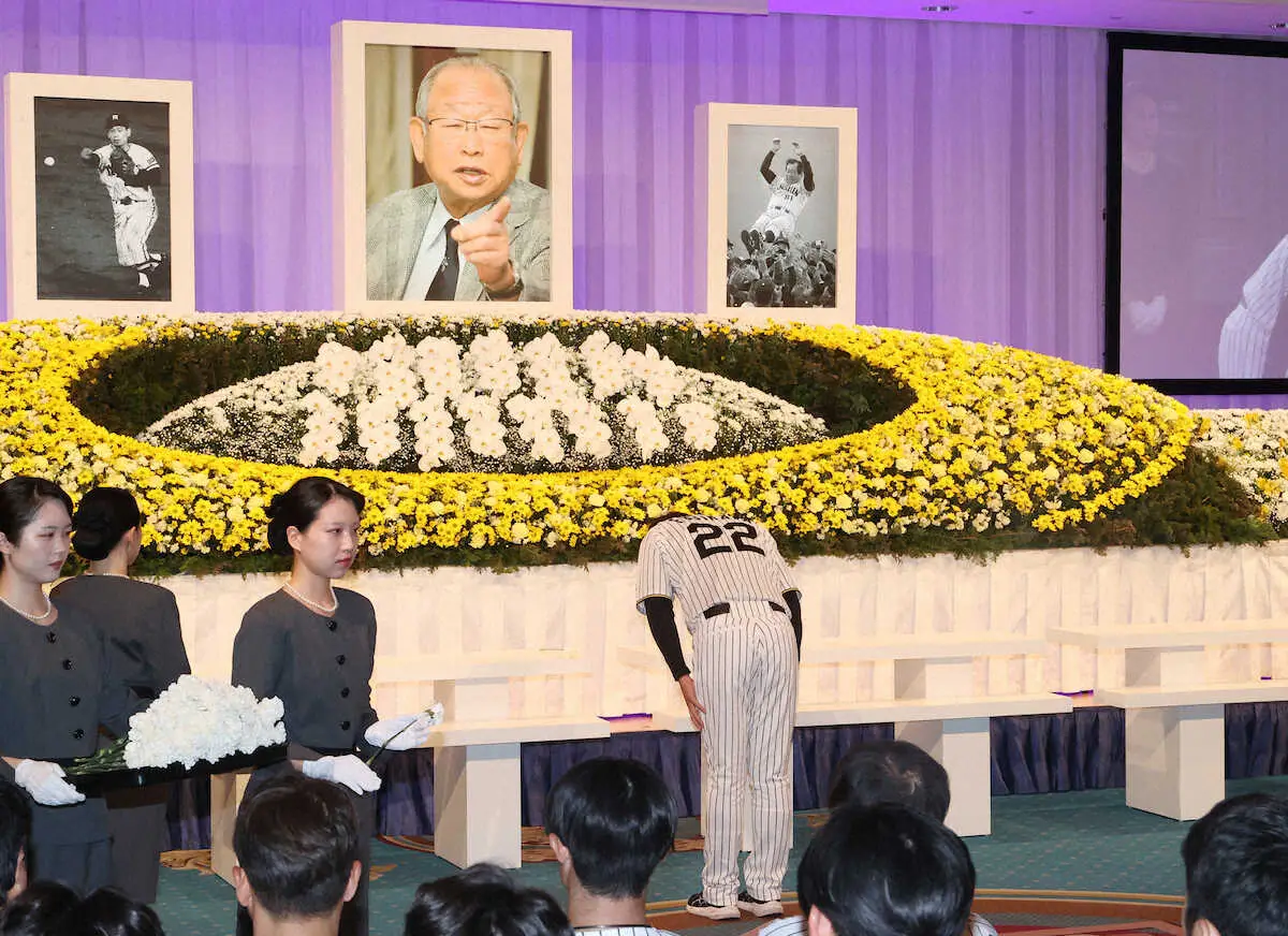 ◇主な参列者 掛布雅之(阪神OB会長)、岡田彰布(阪神オーナー付顧問)、宝馨(高野連会長)、中村勝彦(NPB事務局長)、安藤統男、藤田平、真弓明信、金本知憲、矢野燿大、福本豊、梨田昌孝、池田親興、山本和行、中西清起、佐野仙好、上田次朗、江本孟紀、川藤幸三、柏原純一、黒田正宏、野田浩司、藪恵壹、田尾安志、下柳剛、亀山つとむ、川尻哲郎、今岡真訪、桧山進次郎、湯舟敏郎、浜中治、月亭八方、松村邦洋、成瀬國晴 (順不同、敬称略)
