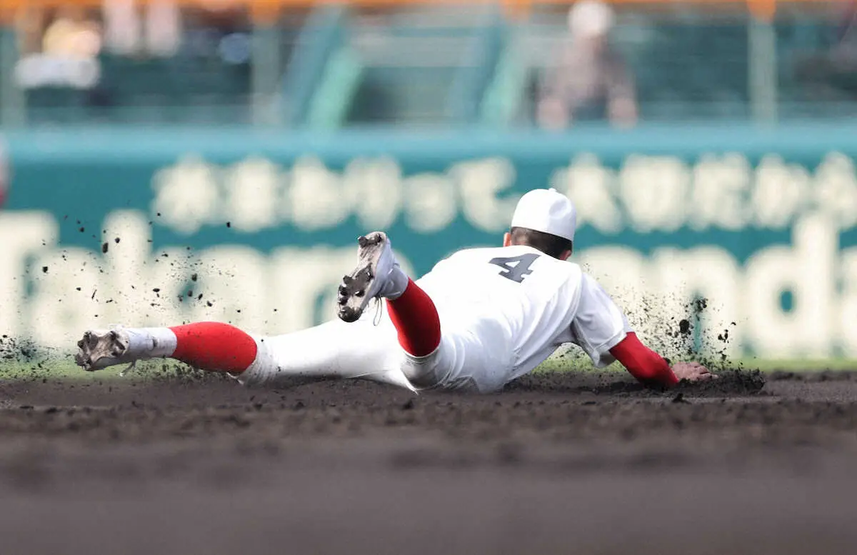 【光る君の光プレー】一つのアウトを取りきる。その強い思いが美技を生んだ。3―1の2回2死三塁、智弁和歌山の背番号4の遊撃手・黒川梨大郎(りんたろう=2年)は二遊間を抜けそうなゴロをダイビングキャッチ=写真=すると、素早く起き上がり一塁送球してアウトにした。1点を返され、なおも続くピンチで流れを止める好プレーだった。