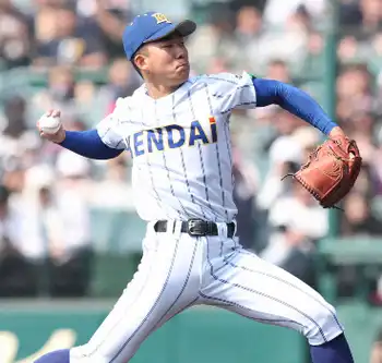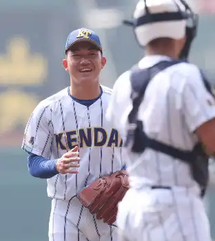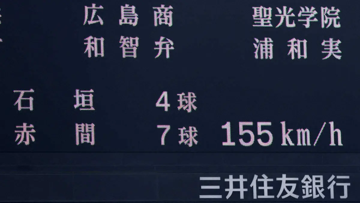 続く2番・高間木(3年)の初球から3番・新田(3年)にかけて大会新記録となる155キロを4度も計測。新田にはその155キロを中前打されたが、4番・古城(2年)を138キロのスライダーで空振り三振に仕留めた。155キロは07年夏の佐藤由規(仙台育英3年)と13年夏の安楽智大(済美2年)もマークしており、甲子園球場の表示における高校球児の球速タイ記録となった。
