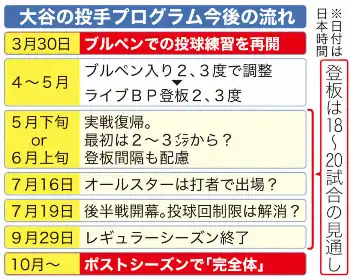 マイナー登板を経ずに復帰する方針で、今季の登板数は間隔を空けながら18~20試合になる見込み。「シーズン終盤」すなわちワールドシリーズ連覇を狙うポストシーズンで期待される投打二刀流フル回転から逆算し、ぶっつけ本番で戻る実戦マウンドは5月下旬~6月上旬が現実的な見立てとなりそうだ。