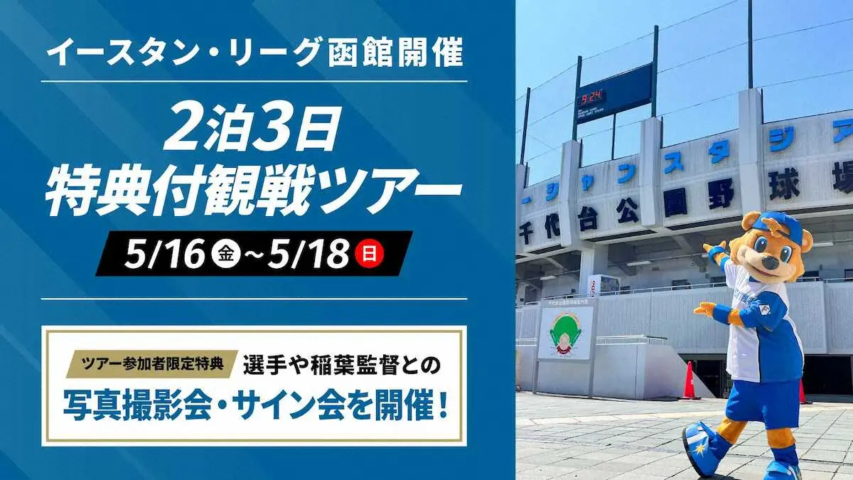 ツアーは函館市内の観光に加え、17日の試合後は選手とのサイン会や撮影会を実施予定。18日は稲葉2軍監督との集合写真撮影会なども行われる。