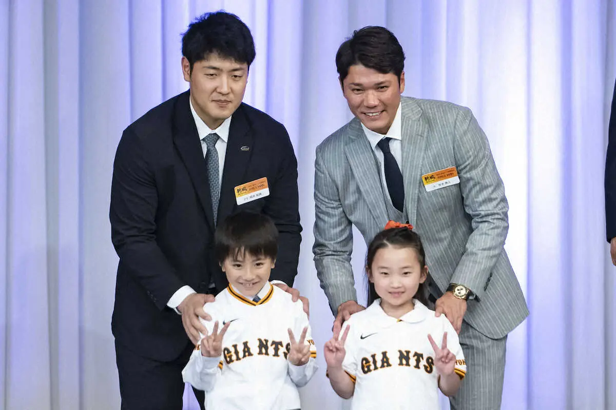 >激励会で子供と記念撮影する巨人・岡本(左)、坂本