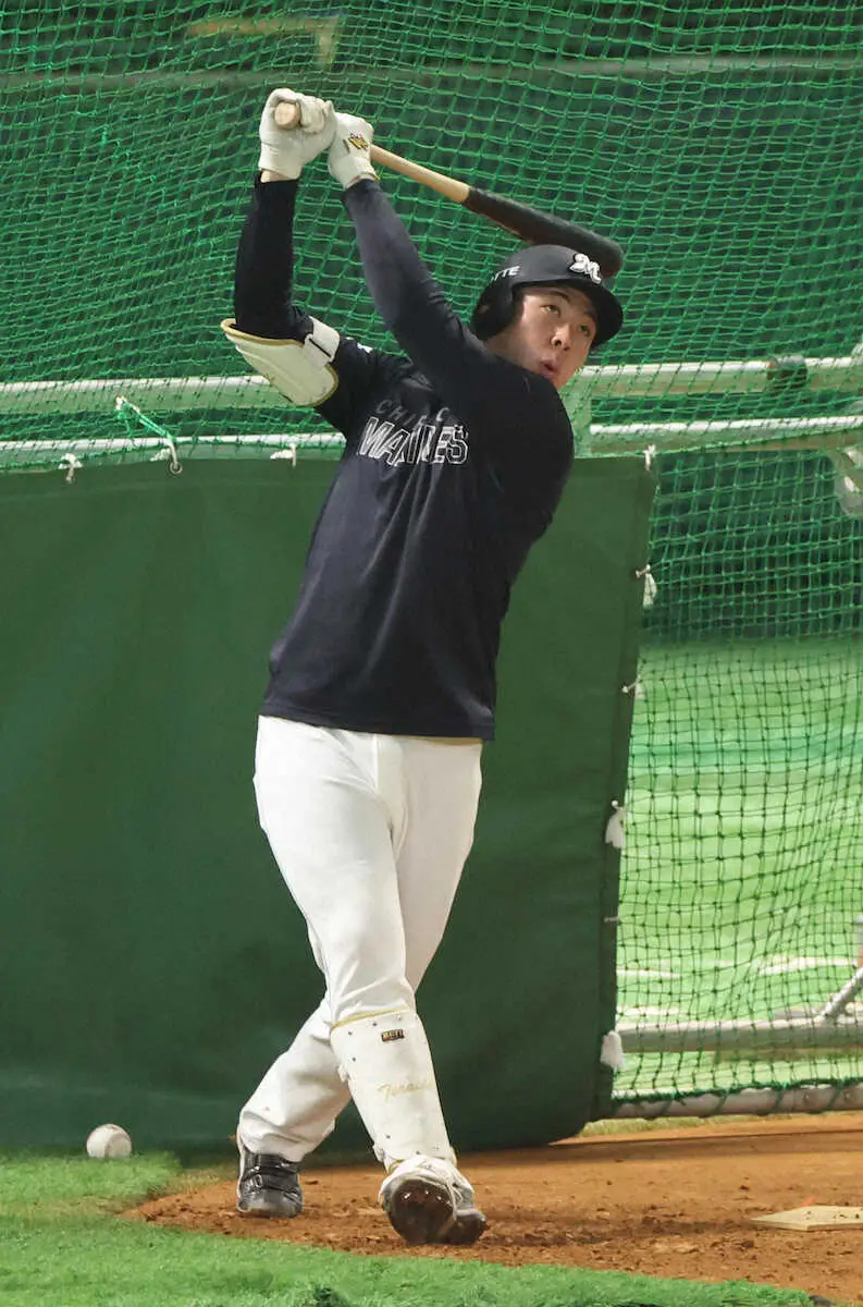 打撃練習を行うロッテ・寺地(撮影・成瀬 徹)