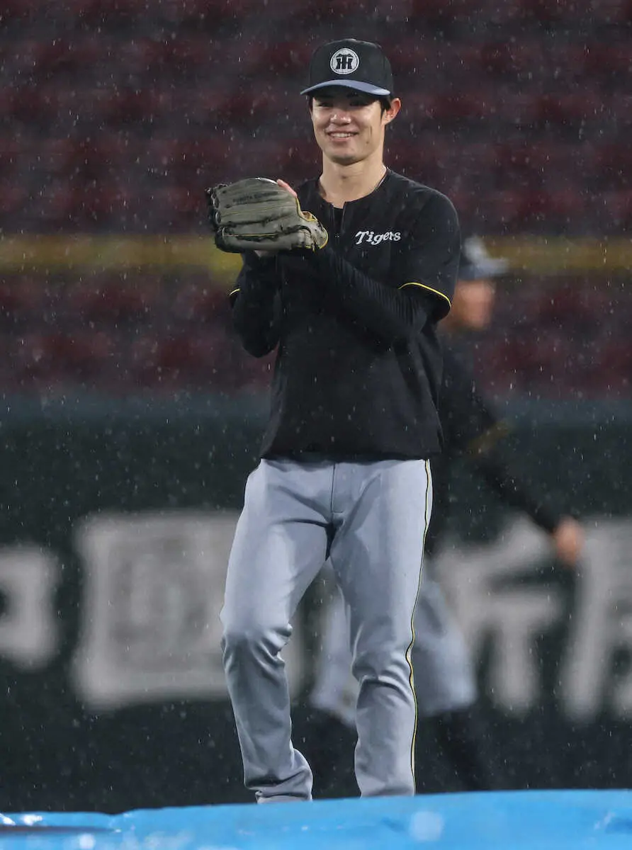 雨の中、守備練習をする阪神・中野(撮影・平嶋 理子)
