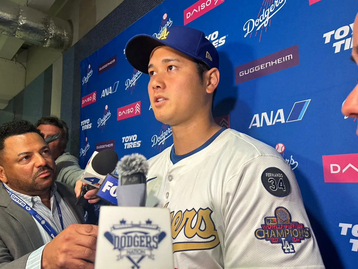 試合後、取材に応じるドジャース・大谷(撮影・柳原 直之)
