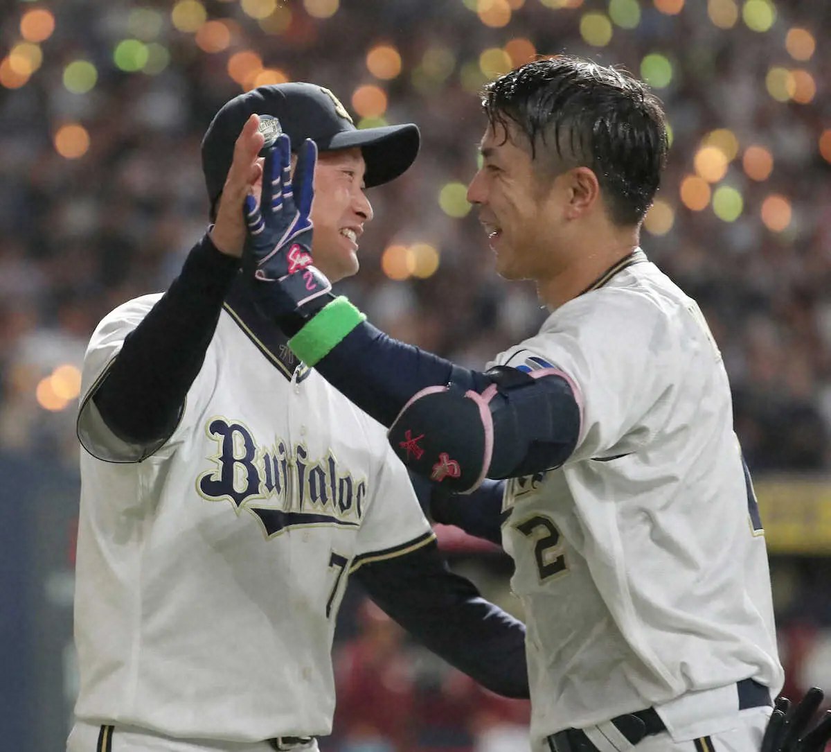 <オ・楽>9回2死二塁、サヨナラ打を放った若月(右)を笑顔で迎えるオリックス・岸田監督 (撮影・奥 調)
