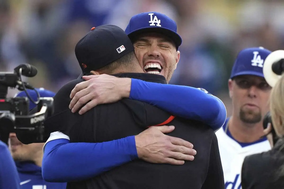 試合前セレモニーでタイガースに移籍したフラーティに優勝リングが贈られ、笑顔でハグするドジャース・フリーマン(AP)