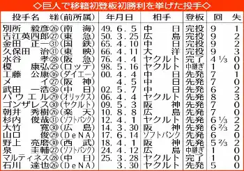 国内他球団から巨人に移籍し初登板初勝利は前記の2人まで19人。田中将が勝てばちょうど20人目で、同一年に3人がマークすれば00年の2人(工藤公康=前ダイエー、メイ=前阪神)を上回り球団初になる。また、36歳での達成は前記工藤と02年武田一浩(前中日)に並ぶ最年長にもなる。