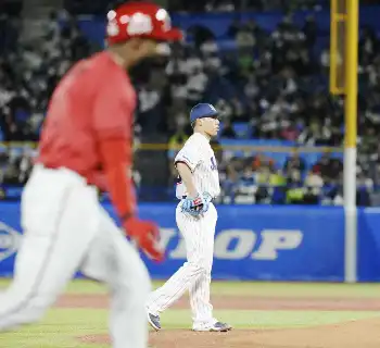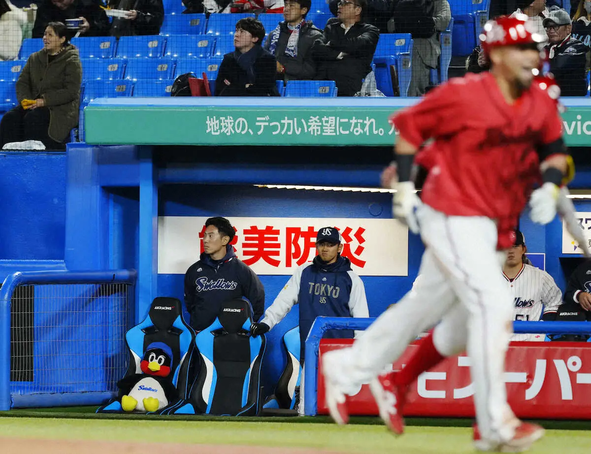 <ヤ・広>2回、ファビアンに2ランを浴び、厳しい表情を見せる高津監督(撮影・五島 佑一郎)